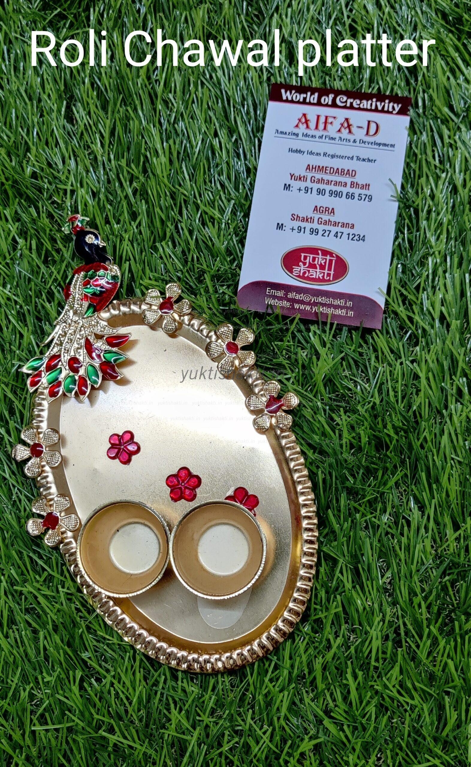 Metal decorated roli chawal platter with Kundan peacock.